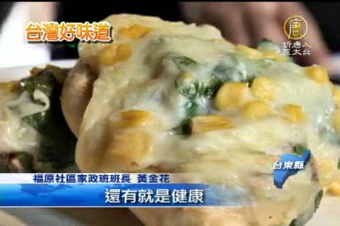 福原社區家政班班長 黃金花:「低油、低糖,我們是算高纖,還有就是健康,以健康為主啦!吃起來的時候,它就有那個米香,也有米的味道。」