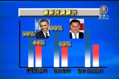 【新唐人亞太台2012年9月27日訊】一份26號公布的由昆尼皮亞克大學為紐約時報和哥倫比亞廣播公司新聞網所做的美國總統大選民調,角逐連任的民主黨候選人歐巴馬在三大搖擺州的支持度都領先共和黨候選人羅姆尼,並且拉大了領先幅度。