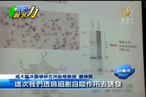 【新唐人亞太台2012年9月27日訊】高開發國家老人化越來越快速,老人失智症將成為人類面臨最嚴峻的問題,成功大學與中央研究院合作,成功發現雷帕黴素可用於減緩並治療額顳葉退化症,減緩失智症惡化,目前實驗成果已經發表在國際重要期刊上,也讓台灣的醫療研究成果讓國際看見。