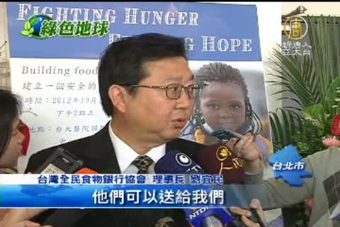 【新唐人亞太台2012年10月1日訊】您知道嗎,儘管現在物價飆漲,不過因為全球仍有三分之一的食物被浪費掉。2006年創立的全球食物銀行組織,希望整合全球糧食分配,台灣今天正式加入全球食物銀行,成為第24個會員國,希望未來能整合食物資源,達到物盡其用,貨暢其流。