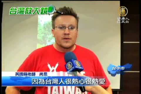【新唐人亞太台2012年10月3日訊】一個簡單的高舉雙手動作,也可以傳達愛臺灣的心!由來台八年的英國籍老師尚恩發起的「舉手愛臺灣、共創世界紀錄」活動,將在國慶日當天號召 2012人身穿紅色T恤,於台中市政大樓廣場拼出我愛臺灣紅人標誌的「人體馬賽克」,可望一舉打破目前1458人的金氏世界紀錄,要讓全世界都知道臺灣人 都是愛臺灣的。