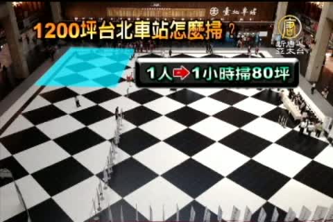 【新唐人亞太台2012年10月5日訊】台北車站是全國最大的車站,大廳面積足足有1200坪,8層樓高,過去清潔人員常常打掃到腰酸背痛,甚至還會閃到腰,最近包商引進新款的推塵車和洗地車,一台車的效能可以抵5個人,上午台鐵首度公開清掃畫面,彷彿在大閱兵,面相當壯觀。