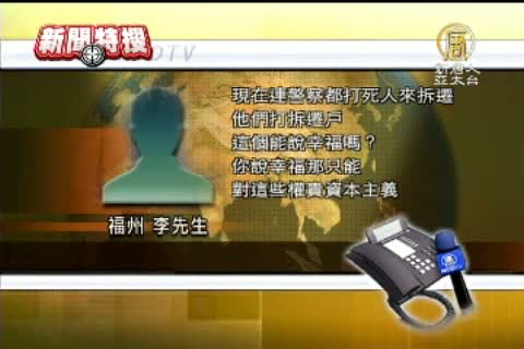 福州 李先生:「現在連警察都打死人來拆遷,他們打拆遷戶,這個能說幸福嗎? 你說幸福那只能對這些權貴資本主義,權貴集團的那些人可以說幸福,他們很幸福的,他們的錢幾百億,我們連稀飯都吃不上。我的看法,幸福應該要民主,民主自由,這才是幸福,你連自由還沒有,你幸福在哪裡?」
