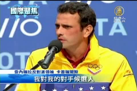 【新唐人亞太台2012年10月8日訊】國際新聞焦點,帶您來看到,委內瑞拉總統大選結果,已經在7號出爐,由現任總統查維斯連任成功,而原本有希望終結他14年統治的反對派候選人卡普瑞爾斯,宣布敗選,對查維斯表示祝賀。