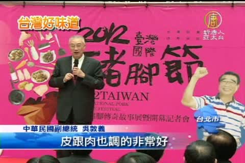 【新唐人亞太台2012年10月12日訊】2012台灣國際豬腳節即將在屏東登場,不過開幕典禮特別選在人潮眾多的台北車站舉行,副總統吳敦義12日出席剪綵,吳敦義透露,自己很愛吃豬腳,他也期許,台灣除了有豬腳美食,還有許許多多的美景、人民的美德,這三美,為台灣爭取更多的國際觀光客。