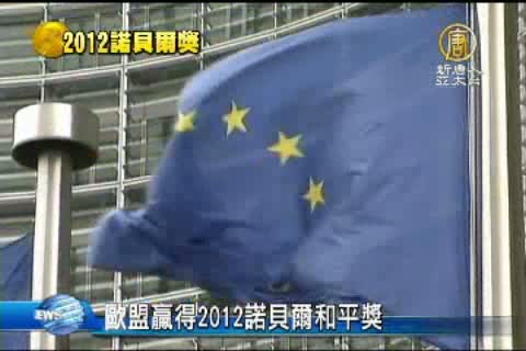 【新唐人亞太台2012年10月12日訊】新聞頭條,首先看到,挪威諾貝爾委員會最新宣布,2012年諾貝爾和平獎,是由歐洲聯盟獲得。諾貝爾評委 表揚歐盟在這60年來對歐洲和平、和解、民主及人權進展的重大貢獻,這無疑對目前正處於歐債危機的歐元區來說,是一項重大的鼓勵。歐洲議會議長舒爾茲在發表聲明時表示,歐盟獲頒這個獎項,他非常感動也感到驕傲。
