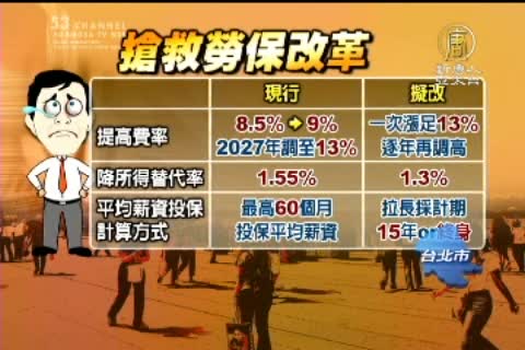 【新唐人亞太台2012年10月18日訊】勞保基金瀕臨破產,馬政府規劃調整所得替代率、保險費率、和平均月投保薪資等方向,要「大家都做點犧牲」,未來全國980萬勞工將會面臨「繳更多,領更少」,民進黨立委點名勞委會主委潘世偉應該下台,更要求政府,必須把軍保、公保一併檢討才公平。