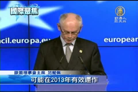 【新唐人亞太台2012年10月20日訊】歐盟理事會主席范龍佩星期五(19日)表示,歐盟27國領導人在布魯塞爾峰會一致同意,在今年底前建立一個法律框架,使歐洲央行全面負責銀行的監管,並將在2013年逐步實施。