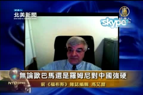 本台記者採訪到了曾擔任《富比士》雜誌編輯的馮艾盟(Eamonn Fingleton)先生。馮艾盟指出,美國的政治受到華爾街的影響,歐巴馬或羅姆尼對中共態度趨緩。
