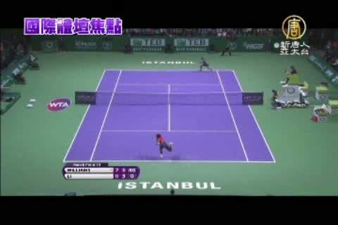 【新唐人亞太台2012年10月25日訊】在土耳其舉行的WTA女子網球年終賽,第2天賽程,世界排名第三的小威廉絲,雖然首盤雙發失誤,但仍以直落二成績擊敗中國網球好手李娜。而莎拉波娃遭遇苦戰,但最後以3盤逆轉拉德萬斯卡 ,莎拉波娃和小威廉絲雙雙闖進4強。
