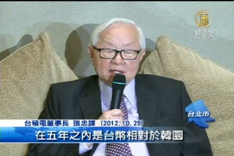 【新唐人亞太台2012年10月26日訊】台積電董事長 張忠謀昨天公開表示,不看好世界景氣,並且批評馬政府的匯率政策,讓台灣出口競爭力不如韓國。不過,行政院院長陳沖今天回應,匯率並不是影響企業出口競爭力的唯一因素,而且如果放手讓台幣貶值,將會衝擊國內物價。