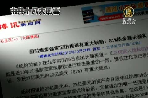 【新唐人亞太台2012年10月29日訊】美國《紐約時報》指稱中共總理溫家寶的家族聚斂大筆財富的報導,猶如投出一顆「震撼彈」,引發各界強烈關注。這顆炸彈被認定與中共高層中的某些派系有很深的關聯,也有報導指稱《紐時》所披露的內容有「重大缺陷」。當局會通過此事揪出哪些「幕後黑手」還有待觀察,據傳,溫家寶家人已通過兩名北京律師發表聲明,作出回應。