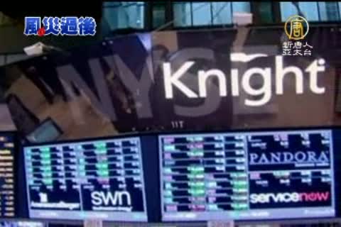 【新唐人亞太台2012年11月1日訊】關閉2天之後的華爾街股市恢復交易,週三 美國各主要股市分別以小幅下跌或些微上漲作收。分析師估計,桑迪颶風為紐約證交所和納斯達克分別造成110萬及120萬美元的損失。而對整個美國東岸 造成的經濟損失,初估將高達三百億至五百億美元。
