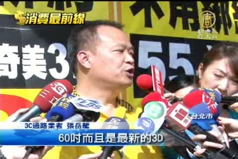 【新唐人亞太台2012年11月9日訊】鴻海推出60吋大電視昨天正式亮相,綁約價一台不用4萬元,震撼市場!不過今天有3C業者對郭董嗆聲,也對消費者喊話,說如果電視不是用大牌子的話,在親戚朋友面前沒面子,並且打出55吋、內建無線上網功能的聯網電視,不用綁約,促銷價3萬元有找。