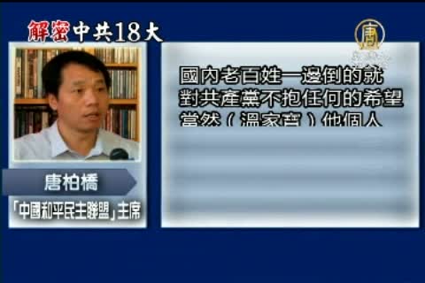 「中國和平同盟主席」 唐柏橋:「他們就是向全世界發一個戰書,就是你們要民主自由,我們堅決不給你們。所以現在整個國際輿論的評價,國內老百姓一邊倒的就對共產黨不抱任何的希望。當然(溫家寶)他個人可能有些情緒啊,或者說他個人有些觀點不是很認同,這個是有的。但是現在說白了已經無所謂了。」