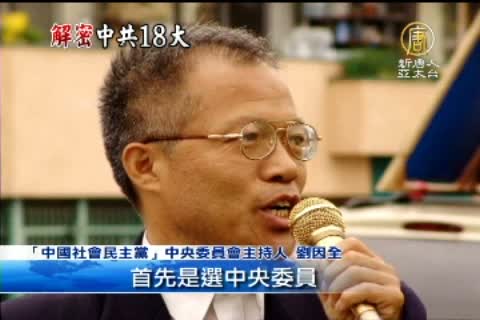 「中國社會民主黨」中央委員會主持人 劉因全:「首先是選中央委員,然後再提交一份政治局候選人名單,這個候選人的名單還是由十八大主席團的常委提出來。事實上,按照目前情況看,我想還是以胡錦濤,習近平,以他倆的意見為主導。」