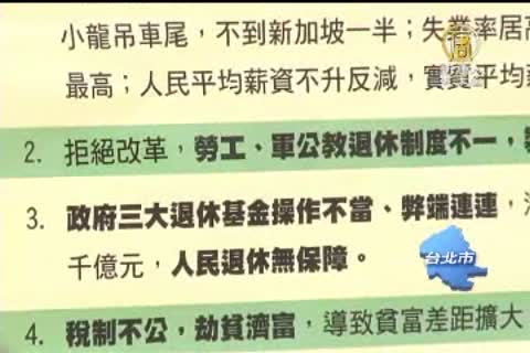 民進黨財經對策小組召集人 吳榮義:「台灣的國家安全在馬英九的政策底下,威脅到我們台灣2千3百萬台灣人民的安全。所以為了救我們自己,為了台灣的經濟以及安全,為了我們的下一代,就必須來採取行動。」