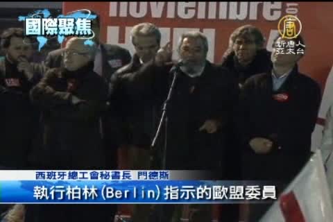 西班牙總工會秘書長門德斯(Candido Mendez):「會造成今天的狀況其根源在歐洲的(緊縮)政策,就如同我們正在談論的,在西班牙我們這裡有的問題是被其他國家強加所造成的問題,執行柏林(Berlin)指示的歐盟委員會把這些緊縮政策強加給我們;而且西班牙政府的領導人不僅接受這個政策,也很大力的來推動,就像是一種嗜好一樣。」