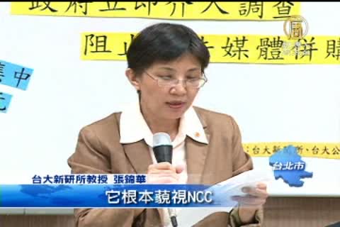 台大新研所教授 張錦華:「中嘉案的併購案,還沒有落幕,現在旺中集團居然更大肆的希望購買更多的報紙跟電視台,它根本藐視NCC維護媒體產業健全發展,跟多元文化的職責。」