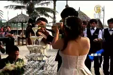 【新唐人亞太台2012年11月16日訊】近年來風行歐美的沙灘婚禮吹進台灣,日前(14號)高雄飯店業者結合十家婚宴相關企業,推出西子灣沙灘婚禮體驗活動,邀請十對戀人提前享受,在美麗夕陽下,承諾牽手一生的甜蜜感覺。