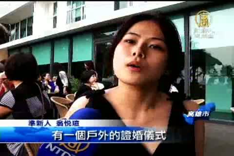 【新唐人亞太台2012年11月17日訊】近年來風行歐美的沙灘婚禮吹進台灣,日前(14號)高雄飯店業者結合十家婚宴相關企業,推出西子灣沙灘婚禮體驗活動,邀請十對戀人提前享受,在美麗夕陽下,承諾牽手一生的甜蜜感覺。