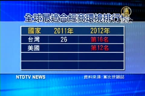 富比世雜誌公布2012年全球最適合經商環境排行榜,台灣從去年的第26名躍升為第16名,美國第12名,中國第96名。美方強調,論投資環境,美國比中國更具有優勢。