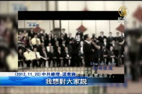 (2012.11.20)中共總理 溫家寶:「我想對大家說,還有幾個月我就要退休了,歸隱林泉。我總覺得似乎還有很多事情還沒有做完,還有很多事情還沒有辦好。」