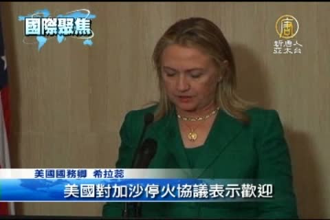 美國國務卿 希拉蕊:「美國對加沙停火協議表示歡迎。為了維持停火協議,來自加薩的火箭襲擊必須停止,恢復平靜局勢。」