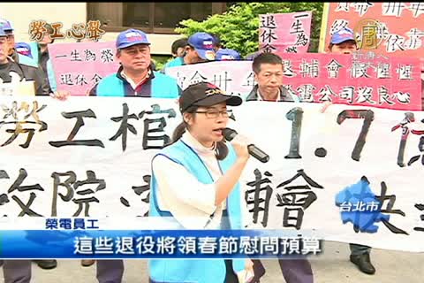 榮電員工:「如果退輔會不能解決榮電員工的問題,350個員工都活不下去,這些退役將領,一個月、兩個月的年終,還要不要發給他們?不要!所以我們今天到立法院來,我們希望立法委員,凍結退輔會這些退役將領春節慰問預算。」