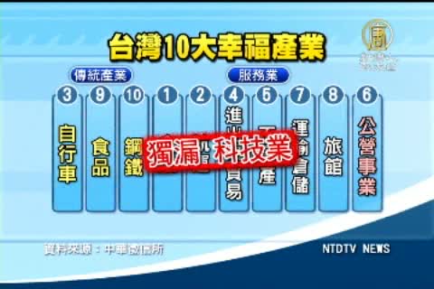 【新唐人亞太台2012年11月28日訊】中華徵信所依據工作薪資、工作內容、福利制度、工作成就、升遷機會等5項指標,再加上產業財務指標,評選出10大幸福產業,公佈調查結果,前三名為金融業、航運業、自行車業,前十名中服務業占6席,傳統產業占3席,公營事業排名第6,本次調查中科技類別產業全排在10大幸福產業之外。