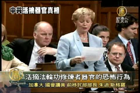 加拿大國會議員 朱迪‧斯格羅:「議長先生,雖然中國最近宣布,計劃實施器官捐贈系統,淘汰摘取死刑犯器官的做法。但事實上,中國官員一直在受到指控,因為他們還在繼續強行活摘法輪功修煉者器官的恐怖行為。」