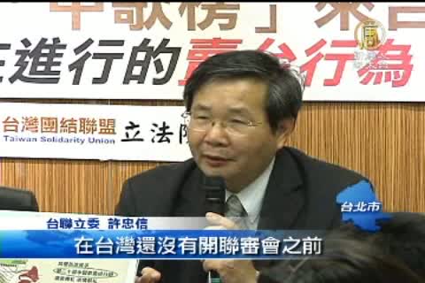 【新唐人亞太台2012年12月3日訊】從旺中併購案,到壹傳媒交易,投資中國的紅頂商人,對台灣媒體掌控滲透的現象,可以說是越來越嚴重,下面的新聞,要進一步帶您看到,中國歌曲排行榜,簡稱中歌榜,預定這個月月底,要在台北小巨蛋舉行頒獎典禮,不過因為獎項有矮化台灣之嫌,引發爭議,而且值得注意的是,在台灣官方審查還沒核准之前,大陸主辦方,就已經搶先公佈頒獎典禮要在台灣舉行,甚至還有大陸旅行業者,搭順風車大肆宣傳中歌榜的台灣套裝行程。這讓立委質疑,為什麼大陸能如此篤定:此案會通過?