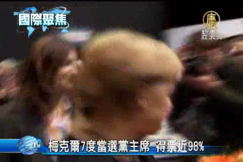 【新唐人亞太台2012年12月5日訊】德國總理梅克爾4日在民調高度支持下,第7次連任基督教民主黨黨主席,取得97.9%的黨代表票,成為她連續參選以來,獲選支持率最高的一次。