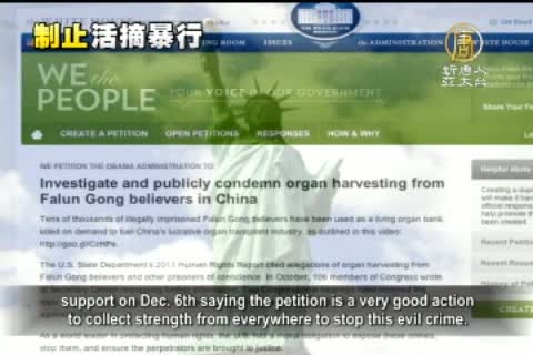 【新唐人亞太台2012年12月10日訊】鏡頭轉到美國。由美國著名醫學專家、國際醫學倫理研究權威、美國「紐約大學醫學院」教授卡普蘭博士等三位醫生,12月2號在白宮網站發起的公開徵集簽名活動,到10號下午,已經有6471多人簽名支持。這項公開徵集簽名活動,是要求歐巴馬政府,調查並公開譴責「中共活摘法輪功學員和其他囚犯器官」的罪行。