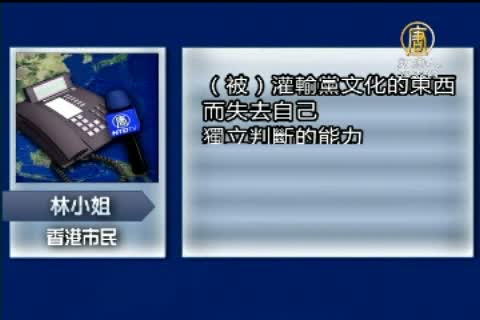 香港市民 林小姐:「香港現在遊行(多),我想是因為有地下黨背景的梁振英上台之後,他的很多政策都比前兩屆的特首更傾向中共,而且有很多赤裸裸的行為。大家知道『反國教』運動,為什麼會在社會上(有)那麼大的反響,也就是說大家都不希望自己的孩子,像國內的小朋友一樣,(被)灌輸黨文化的東西,而失去自己獨立判斷的能力。」