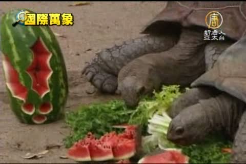 這隻亞達伯拉象龜(Aldabra)縮著身子,津津有味的享用著牠的聖誕禮物,這是用西瓜雕刻成的聖誕樹和一些生菜葉子。