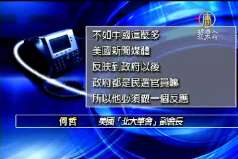 美國「北大筆會」副會長 何哲:「中國像這種事很多,把小孩打死,甚至下毒,拿刀捅啊等等,美國這種事情從絕對數量上來講不如中國這麼多。因為美國新聞媒體反映到政府以後,政府都是民選官員嘛,所以他必須做一個反應,表態啊什麼的。 中國因為沒有民選制度,所以官員對媒體的反應,對這事他可以不作出反應。」