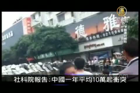 中國社科院週二發布報告稱,近年,大陸每年因各類社會矛盾發生群體性事件多達10萬多宗。以徵地拆遷、環境污染衛生和勞動爭議為多。