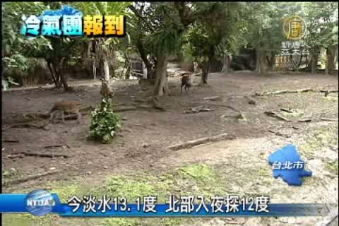 【新唐人亞太台2012年12月18日訊】冷氣團報到,上午平地淡水已經出現了13.1度的低溫,氣象局表示,北部空曠地區,入夜甚至可能下探12度,但因為水氣不足,高山降雪機會不高。面對冷氣團來襲,木柵動物園裡的動物,也準備好各式過冬妙方,許多動物反而更是越冷越開心。