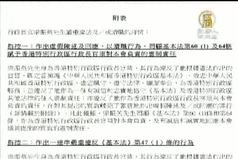 香港立法會議員(法律界) 郭榮鏗:「有多次在立法會答問會期間,向本會做出嚴重的失實聲明,就是說大話。這是違反做為特首的憲制責任,這個我們認為是構成瀆職的行為。」