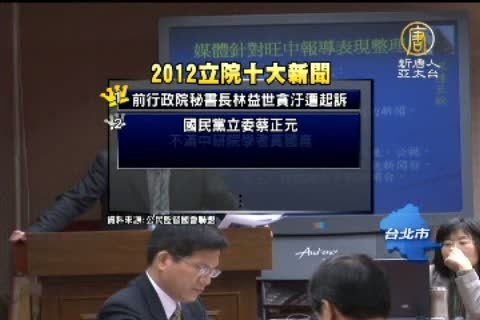 【新唐人亞太台2012年12月28日訊】公民監督國會聯盟今天(28日)公布立法院年度十大新聞和代表漢字,民間團體選出的年度代表字是廢棄的「廢」。因為從美牛案、軍公教年終慰問金爭議 都讓民眾感到議事延宕、朝野對立。而社運團體的年度社運風雲人物頒獎,由於2位得主 關心的議題都 和 立法有關,特地選在立法院群賢樓外頒獎。 讓歲末年終前最後一次 開議的立法院,很熱鬧。