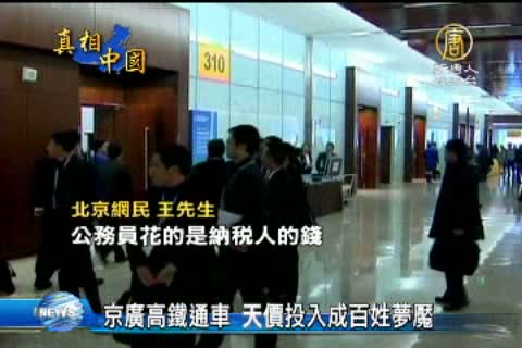 【新唐人亞太台2012年12月29日訊】被稱為世界最長距離的「京廣高速鐵路」試車成功:全線300公里的時速,從北京到廣州僅需8小時,比原來最快列車快了12多個小時。但花費近4000億的天價,讓人想到腐敗的加重﹔每年巨額的利息,使得運營面臨數十年的虧損﹔高昂的票價也令普通百姓大呼「坐不起」。