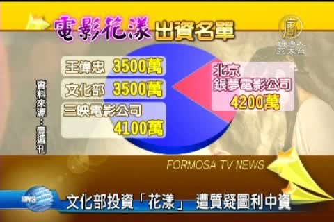 【新唐人亞太台2013年1月2日訊】由文化部投資的電影《花漾》,再過不久就要在中國上檔,分紅卻引發爭議,根據週刊揭露,文化部和王偉忠的台灣文創一號,投資1億1千多萬,比來自中國的投資4千萬還多,是這部電影的大股東,卻簽下不平等條約,要在中國票房超過5千萬人民幣,才能分紅,而且也只拿到2%的分紅,連電影系教授都說,實在不合理。