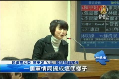 民進黨立委 陳亭妃 V.S. 國防部副部長 高廣圻:「看不到整個國防部的未來,軍情單位又再縮編,然後現在似乎國防部跟國安局又喬不攏。(沒有,沒有),一個軍情局搞成這個樣子」「我們評估過軍情局可以在這樣精粹案裡面來縮編,它還能執行它的任務」