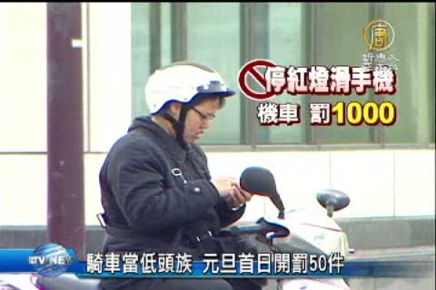 【新唐人亞太台2013年1月2日訊】開車、騎車時習慣低頭用手機的民眾,特別注意,因為已經有人挨罰了。一月一號正式上路的交通新法,嚴格取締駕駛低頭族。執法第一天,全台違規超過50件,開單最密集的在雲林,一天就開出16張件。受罰的絕大部分是停紅燈時滑動手機打發時間 。