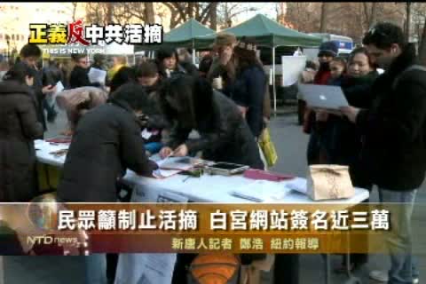 【新唐人亞太台2013年1月3日訊】新聞頭條,首先來看到,為制止中共活摘器官暴行,2012年12月2日,由美國三位醫學專家在美國白宮網站上共同發起的一項簽名連署活動,呼籲歐巴馬總統及美國政府,對目前正發生在中國大陸大量法輪功學員被活摘器官的事件進行調查。直至目前為止,已有近3萬人簽名支持,而且人數還在不斷增長。由於在一個月內達到徵集兩萬五千人的連署門檻,接下來,白宮官方如何回應,各界關注。