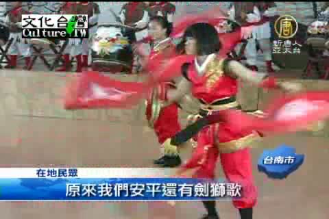 【新唐人亞太台2013年1月3日訊】台南安平,在清朝時是水師駐紮之地,每當士兵操練結束返家時習慣將劍、盾掛在門口的架子上,看似獅子咬著一把劍,這也會讓宵小以為家有男丁,不敢冒犯,慢慢地,劍獅就演變成安平居民興建屋宅的辟邪祈福之物。近年來,地方政府與藝術工作者積極將劍獅與文創活動結合,還創造出劍獅歌與舞蹈創作,希望把劍獅文化推廣到全世界 。