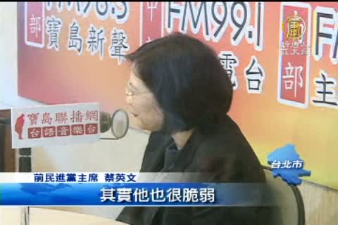 【新唐人亞太台2013年1月7日訊】才剛剛邁入2013年,中共對境內媒體便展開新一輪打壓,來看到一水之隔的台灣,媒體形勢也令人不安。前民進黨主席蔡英文,今天接受節目主持人鄭弘儀專訪時,表示中共方面對台灣的壓力和影響與日俱增,並提出目前台灣面臨的媒體壟斷問題,指出背後的中國因素正在影響台灣的言論市場和民主自由,令人憂心。