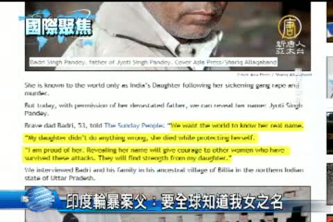 【新唐人亞太台2013年1月7日訊】星期天(6號),印度仍然有數千名婦女聚集在首都新德里遊行示威,希望當局嚴懲巴士性侵案的施暴者,並要求保護婦女、修改刑法。而這起輪暴案受害女大學生的父親巴里,在接受英國《週日人民報》的媒體專訪時,同意公布女兒的真實姓名-喬蒂辛格潘迪,他說:「我們要全世界知道她的真實姓名」。