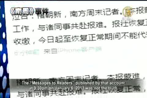 而經官方認證的報社經濟部微博,也發表署名「南周編輯部」的聲明說:南方周末新浪官方賬號已被強行收繳,此微博在2013年1月6號21點30分發表的《致讀者》,並非真相,他們將陸續通過公開途徑 發布準確信息。包括《南周》編委、經濟部、文化部、新聞部等幾十位記者 聯署了這份聲明。同時 已經有多位《南周》記者開始罷工 表示抗議。